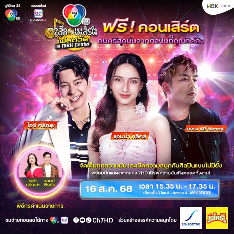ต้อนรับสิงหาคม คอนเสิร์ตดูฟรีที่คุณคิดถึง “7 สีคอนเสิร์ตเฟสติวัล @ MBK Center” จัดเต็มความสนุกอีกแล้ว เสิร์ฟ 2 ศิลปิน 2 สไตล์ กวาง AB Normal, ไอซ์-ศรัณยู ที่มาพร้อม แอนน่า กลึคส์ นางเอกมากความสามารถจากช่อง 7HD มาร่วมโยกสนุกไปพร้อมกัน เสาร์ 16 สิงหาคมนี้ เสิร์ฟความมันกันต่อเนื่องกับฟรีคอนเสิร์ต “7 สีคอนเสิร์ตเฟสติวัล” ที่ ช่อง 7HD ร่วมกับ บริษัท เอ็ม บี เค จำกัด (มหาชน) จัดขึ้น ครั้งที่ 4 ยังคงจัดเต็มความสนุกอีกครั้งที่MBK Center มากรี๊ดให้สุดเสียงกับศิลปินสายร็อก กวาง AB Normal พร้อมศิลปินสายป๊อบ ไอซ์-ศรัณยู และพบกับนางเอกสาวสุดฮอตของช่อง 7HD แอนน่า กลึคส์ การันตีความสนุกกับ 2 พิธีกรสายเอ็นเตอร์เทนเช่นเดิม โดยพิธีกรคู่หูสุดแซ่บ เจด้า-ศรัณย่า ชุณหศาสตร์ และ แอมป์-พีรวัศ กุลนันท์วัฒน์ จัดเต็มทั้งเสียงหัวเราะและความมัน แฟน ๆ เตรียมล็อกวันมาจอยกันได้เลย ย้ำกันอีกครั้ง งานนี้เข้าชมฟรี ! วันเสาร์ที่ 16 สิงหาคมนี้ ตั้งแต่เวลา 15.35 น. บริเวณชั้น G ลาน Avenue A ศูนย์การค้า เอ็ม บี เค เซ็นเตอร์ หรือร่วมรับชมถ่ายทอดสดทางช่อง 7HD กด 35 ตั้งแต่เวลา 15.35-17.05 น. และสดทางออนไลน์ Facebook / YouTube / TikTok : Ch7HD และ Bugaboo.tv ที่มันไม่มีเบรก 2 ชั่วโมงเต็ม…
