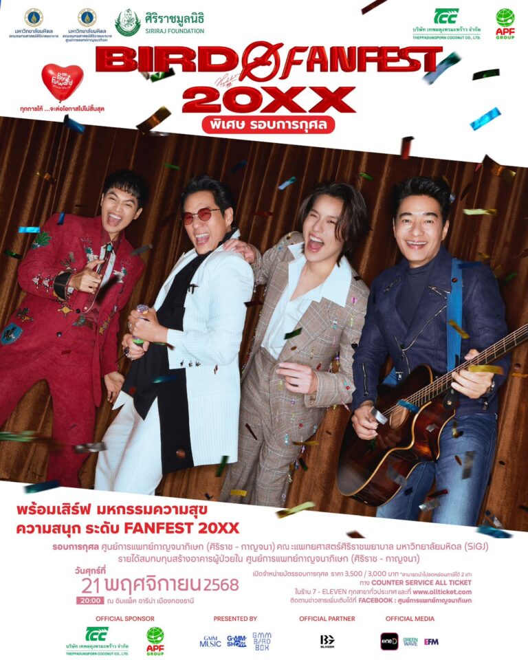 เบิร์ด ธงไชย แมคอินไตย์ ซูเปอร์สตาร์ขวัญใจคนไทยทุกยุค เตรียมคืนเวทีครั้งสำคัญใน “BIRD FANFEST 20XX” มหกรรมความสนุกระดับ FANFEST ในรอบการแสดงวันศุกร์ที่ 21 พฤศจิกายน 2568 เวลา 20.00 น. ณ อิมแพ็ค อารีน่า เมืองทองธานี ซึ่งเป็นรอบพิเศษเพื่อการกุศล โดยรายได้จากการจำหน่ายบัตรรอบดังกล่าวจะนำไปสมทบทุนสร้างอาคารหอผู้ป่วยในแห่งใหม่ของศูนย์การแพทย์กาญจนาภิเษก คณะแพทยศาสตร์ศิริราชพยาบาล มหาวิทยาลัยมหิดล ความพิเศษสุดๆ ของ “BIRD FANFEST 20XX” ครั้งนี้ คือ การโคจรมารวมกันของ 3 ไอดอลนักร้องหนุ่มซูเปอร์ฮอท จากทุกเจเนอเรชัน บิวกิ้น – พุฒิพงศ์ อัสสรัตนกุล…