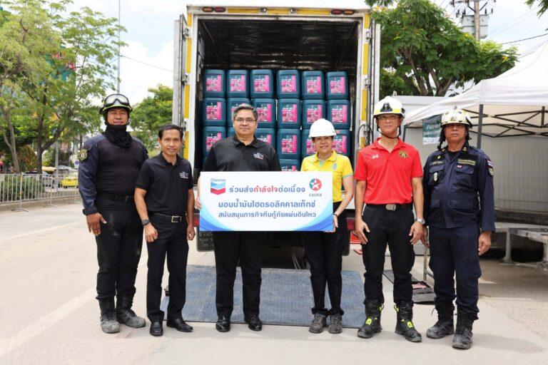 เมื่อเร็ว ๆ นี้ บริษัท เชฟรอน (ไทย) จำกัด ผู้ผลิตและจัดจำหน่ายผลิตภัณฑ์น้ำมันหล่อลื่นคาลเท็กซ์ ฮาโวลีน และคาลเท็กซ์ เดโล่ นำโดย นายสันติศักดิ์ ไทยพัฒน์ ประธานกรรมการและผู้จัดการใหญ่ บริษัท เชฟรอน (ไทย) จํากัด (ที่ 3 จากซ้าย) มอบน้ำมันไฮดรอลิค คาลเท็กซ์ แรนโด้จำนวนรวม 1,620 ลิตร ให้แก่ นางสาวภัทร์กร สินสุข ผู้อำนวยการเขตจตุจักร กรุงเทพมหานคร (ที่ 3 จากขวา) เพื่อสนับสนุนการปฏิบัติภารกิจของเจ้าหน้าที่กู้ภัยในการใช้งานกับเครื่องจักรในการกู้ภัย อาทิ รถขุด รถเครน รถตัก และเครื่องมืออื่น ๆ สำหรับปฏิบัติการค้นหาผู้สูญหายที่คาดว่ายังติดอยู่ใต้ซากอาคารสำนักงานตรวจเงินแผ่นดิน (สตง.) ที่ถล่มลงมาหลังเหตุการณ์แผ่นดินไหว ให้เป็นไปได้อย่างราบรื่นและมีประสิทธิภาพมากยิ่งขึ้น ณ ศูนย์บัญชาการเหตุการณ์ จตุจักร กรุงเทพฯ ### ในภาพจากซ้าย: 1. นายสกล…