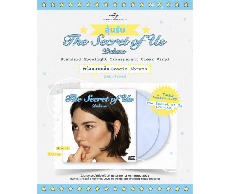 เผลอแป๊บเดียวอัลบั้มที่รวมเพลงเพราะที่สุดแห่งปีอย่าง The Secret of Us (Deluxe) ของสาวสวย Gracie Abrams ก็ครบรอบ 1 ปีเรียบร้อยแล้ว หลายคนยังคงฟังเพลง “That’s So True” พร้อมใช้เพลงนี้ทำคอนเทนต์กันอยู่อย่างต่อเนื่อง และยังฟังเพลงอื่น ๆ ในอัลบั้มกันอยู่จนถึงทุกวันนี้ จนทำให้ตอนนี้ยอดสตรีมอัลบั้ม The Secret of Us (Deluxe)จากทุกแพลตฟอร์มทั่วโลกทะลุ 6 พันล้านครั้งเป็นที่เรียบร้อย และเชื่อว่าหลายคนยังนึกถึงวันที่สาว Gracie Abrams มาเล่นคอนเสิร์ตที่กรุงเทพฯ ครั้งแรกกันอยู่เลย น่าจะเป็นโมเมนต์ที่ทุกคนคิดถึง และนับวันรอให้เธอกลับมาแฟน ๆ ชาวไทยกันอีกเร็ว ๆ ใครที่คิดถึง Gracie Abrams เหมือนกัน เรามีกิจกรรมดี ๆ มาฝากแฟน ๆ ชาวไทยทุกคน ลุ้นรับไวนิลอัลบั้ม The Secret of Us (Deluxe) พร้อมลายเซ็นของ Gracie Abrams ! เพียงแค่ทำตามกติกาง่าย ๆ…