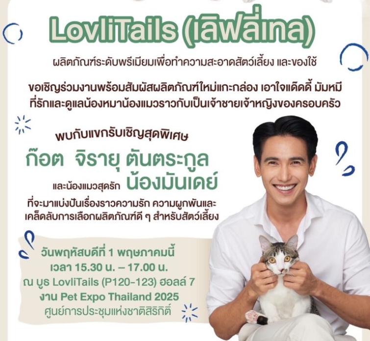 พบกับแขกรับเชิญสุดพิเศษ“ก๊อต” จิรายุ ตันตระกูล และน้องแมวสุดรัก “น้องมันเดย์” ที่จะมาแบ่งปันเรื่องราวความรัก ความผูกพันและเคล็ดลับการเลือกผลิตภัณฑ์ดี ๆ สำหรับสัตว์เลี้ยง – วันพฤหัสบดีที่ 1 พฤษภาคมนี้– เวลา 15.30 น. – 17.00 น.– ณ บูธ LovliTails (P120-123) ฮอลล์ 7งาน Pet Expo Thailand 2025 ศูนย์การประชุมแห่งชาติสิริกิติ์