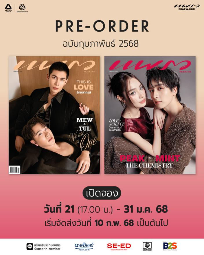 เติมความหวานรับวันแห่งความรัก กับ 2 ปกสุดพิเศษ แฟชั่นเซ็ตสุดหวานของ “มิว ศุภศิษฏ์ & ตุลย์ ภากร” พร้อมบทสัมภาษณ์เรื่องราวความรักจากวันแรกที่รู้จักกัน.. สู่โมเมนต์คุกเข่าขอแต่งงาน และปก กองทัพพีค & มิ้นท์ รัญชน์รวี ที่จะมาเติมความฟินให้ทุกคน กับแฟชั่นพร้อมบทสัมภาษณ์สุดน่ารัก ในนิตยสารแพรว ฉบับ กุมภาพันธ์ 2568 ไม่เพียงเท่านั้น ละลายไปกับแฟชั่นพิเศษจาก เพิร์ธ & แซนต้า ในคอลัมน์ Praew Favor และสกู๊ปประจำฉบับกับ เรื่องราวความรักหลากรส ที่จะทำให้ผู้อ่านได้ค้นพบความรักในแบบของตัวคุณเอง รวมถึงสกู๊ป วิทยาศาสตร์กับความรัก เชื่อมโยงกันได้อย่างไร? เตรียม Pre – Order ได้แล้วตั้งแต่วันนี้ถึง 31 มกราคม 2568 ที่ร้านนายอินทร์ทุกสาขา หรือ https://book-naiin.com/40H4Xn8 และร้านหนังสือชั้นนำทั่วไป
