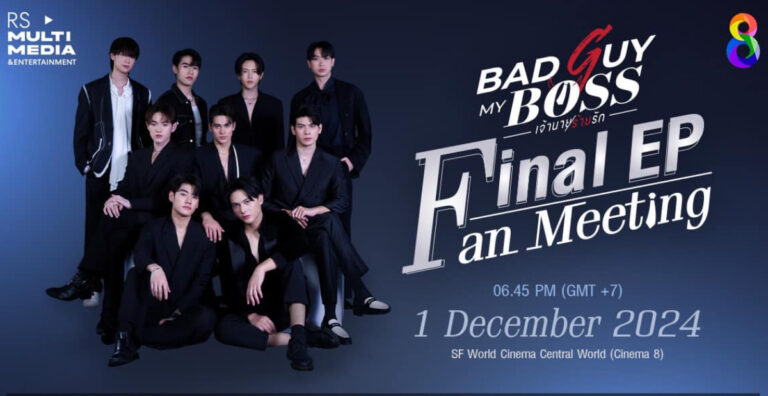เป็นอีกหนึ่งซีรีส์ที่มีกระแสดีอย่างต่อเนื่อง สำหรับซีรีส์ “Bad Guy My Boss เจ้านายร้ายรัก” ทางช่อง 8 ในเครือ อาร์เอส กรุ๊ป หลังจากเรื่องราวได้ดำเนินมาถึงโค้งสุดท้ายในไฟนอลอีพี (อีพี12) ที่จะออกอากาศวันอาทิตย์ที่ 1 ธันวาคมนี้ ล่าสุดนับว่าเป็นข่าวดีให้ชาวด้อมของซีรีส์ได้กรี๊ด เพราะแฟนซีรีส์จะได้มีโอกาสกระทบไหล่นักแสดงในเรื่องอย่างใกล้ชิด และร่วมรับชมตอนจบในอีพีสุดท้ายพร้อมกันในงาน “Bad Guy My Boss Final EP. Fan Meeting” งานนี้นอกจากจะได้รับชมตอนจบของซีรีส์ไปพร้อมกับนักแสดงแล้ว ยังมีเซอร์ไพรส์ Mini Show จากเหล่านักแสดงทั้ง 9 หนุ่ม นำโดย เจมส์ เพรสคอท, กาด พลอยสุภา, นิก กัคช์, แฟ้ม ตนุภัทร, แซค ณัฐภัทร, คิณ อาณาคิณ, เพิร์ธ ณภัทร, มาร์ค ธิระศักดิ์ และ เว็กซ์เตอร์ ศุภมน เตรียมมาให้แฟนซีรีส์แบบจัดเต็ม โดยงาน “Bad Guy My…
