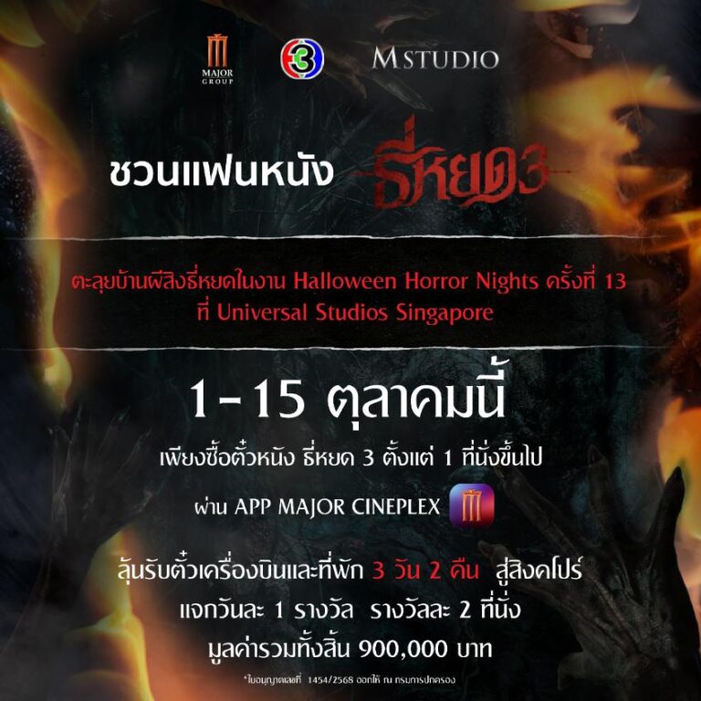 “M STUDIO” และ “ช่อง 3” ชวนแฟนหนังร่วมสัมผัสความหลอนขั้นสุดกับภาพยนตร์ “ธี่หยด 3” พร้อมกิจกรรมสุดพิเศษ ที่จะพาแฟน ๆ ลุ้นบินลัดฟ้าสู่สิงคโปร์ ตะลุยบ้านผีสิง “ธี่หยด” ในงาน Halloween Horror Nights ครั้งที่ 13 ณ Universal Studios Singapore เพียงซื้อตั๋วชมภาพยนตร์ ธี่หยด 3 ตั้งแต่ 1 ที่นั่งขึ้นไป ผ่าน APP Major Cineplex ระหว่างวันที่ 1–15 ตุลาคมนี้ ก็มีสิทธิ์ลุ้นตั๋วเครื่องบินไป–กลับ พร้อมที่พัก 3 วัน 2 คืน สำหรับ 2 ที่นั่ง แจกทุกวัน วันละ…
