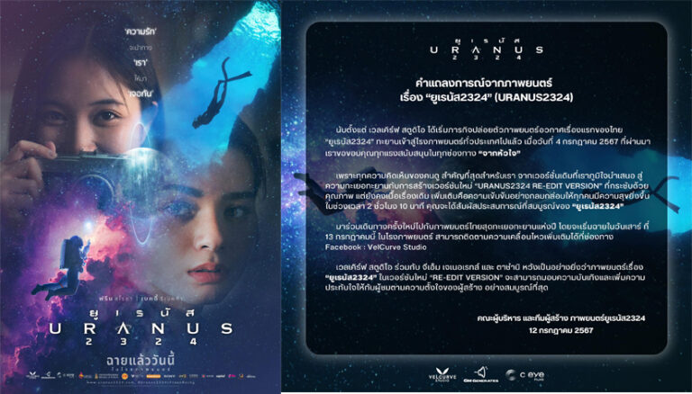นับตั้งแต่ เวลเคิร์ฟ สตูดิโอ ได้เริ่มภารกิจปล่อยตัวภาพยนตร์อวกาศเรื่องแรกของไทย “ยูเรนัส2324” ทะยานเข้าสู่โรงภาพยนตร์ทั่วประเทศไปแล้ว เมื่อวันที่ 4 กรกฎาคม 2567 ที่ผ่านมา เราขอขอบคุณทุกแรงสนับสนุนในทุกช่องทาง “จากหัวใจ” เพราะทุกความคิดเห็นของคนดู สำคัญที่สุดสำหรับเรา จากเวอร์ชั่นเดิมที่เราภูมิใจนำเสนอ สู่ความทะเยอทะยานกับการสร้างเวอร์ชันใหม่ “URANUS2324 RE-EDIT VERSION” ที่กระชับด้วยคุณภาพ แต่ยังคงเนื้อเรื่องเดิม เพิ่มเติมคือความเข้มข้นอย่างกลมกล่อมให้ทุกคนมีความสุขยิ่งขึ้น ในช่วงเวลา 2 ชั่วโมง 10 นาที คุณจะได้สัมผัสประสบการณ์ที่สมบูรณ์ของ “ยูเรนัส2324” มาร่วมเดินทางครั้งใหม่ไปกับภาพยนตร์ไทยสุดทะเยอทะยานแห่งปี โดยจะเริ่มฉายในวันเสาร์ ที่ 13 กรกฎาคมนี้ ในโรงภาพยนตร์ สามารถติดตามความเคลื่อนไหวเพิ่มเติมได้ที่ช่องทาง Facebook : VelCurve…