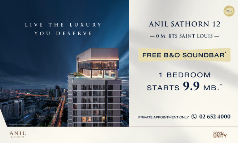 แกรนด์ ยูนิตี้ ส่งแคมเปญสุดพิเศษรับหน้าฝน เอาใจคนเมืองที่กำลังมองหาคอนโดมิเนียมพร้อมอยู่ในทำเล Real CBD ย่านศูนย์กลางธุรกิจ ที่มาพร้อมมาตรฐานการก่อสร้างและแนวคิดโครงการที่ได้รับการยอมรับในระดับนานาชาติ กับโครงการ “อนิล สาทร 12 (ANIL Sathorn 12)” คอนโดมิเนียมระดับซูเปอร์ลักซ์ชัวรี ติด BTS เซนต์หลุยส์ 0 เมตร และเป็นคอนโดมิเนียมแห่งแรกในประเทศไทยและภูมิภาคเอเชียตะวันออกเฉียงใต้ที่ได้รับการรับรองมาตรฐานสุขภาวะสำหรับผู้อยู่อาศัยระดับโลก WELL Certified™ Multifamily Residential Project ระดับ Gold โดยมอบข้อเสนอพิเศษมากมาย อาทิ ฟรี B&O Soundbar* จาก Bang & Olufsen แบรนด์เครื่องเสียงระดับไฮเฮนด์จากประเทศเดนมาร์ก, ฟรี เครื่องใช้ไฟฟ้าจาก Bosch*, และฟรี ค่าใช้จ่ายวันโอน* ในราคาเริ่มต้นเพียง 9.9 ล้านบาท* ตั้งแต่วันนี้ถึง 30 มิถุนายนนี้ เท่านั้น (ยูนิตราคาพิเศษมีจำนวนจำกัด) นายกำพล ปุญโสณี ประธานบริหาร บริษัท แกรนด์ ยูนิตี้…